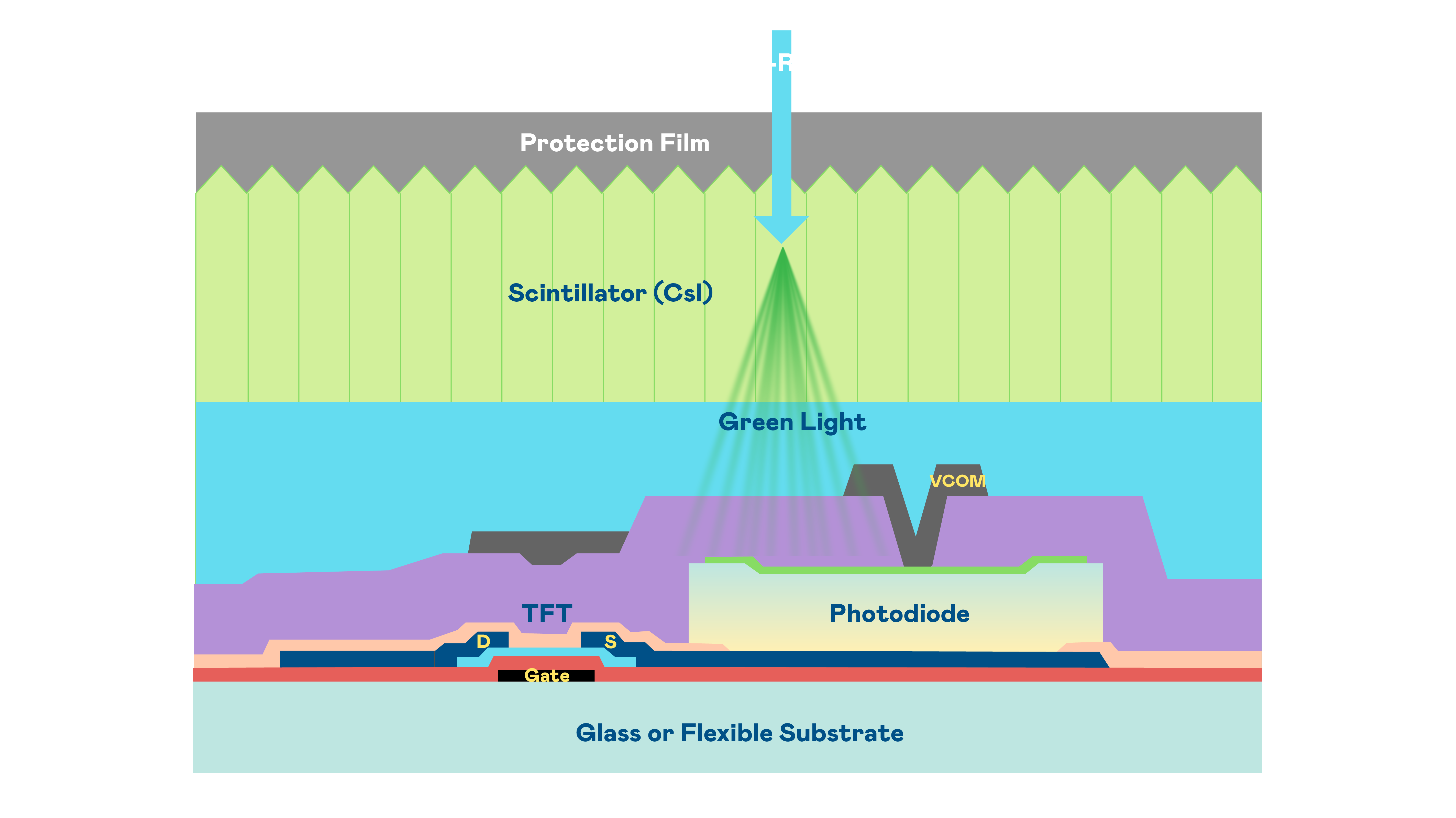 凯发娱乐的X光影像感測陣列使用薄膜電晶體 (TFT) 作為每個像素的讀取開關,搭配光電二極體(Photodiode)的光電轉換元件,用以感測X光影像訊號。
